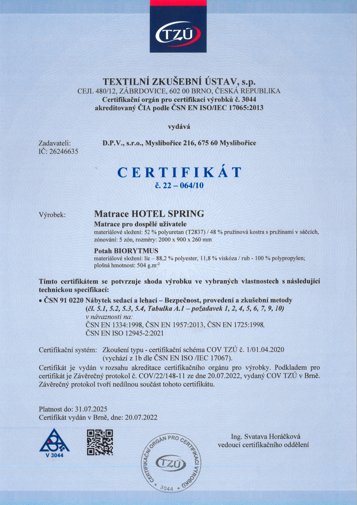 Metodické doporučení Státního zdravotního ústavu č. 1/2000 k posuzování výrobků, které přicházejí do přímého styku s lidským organismem prostřednictvím kůže, popřípadě sliznic osvědčuje, že materiály odpovídají hygienickým požadavkům uvedené specifikace, jsou vhodné na potahy matrací a nepředstavují zdravotní riziko.