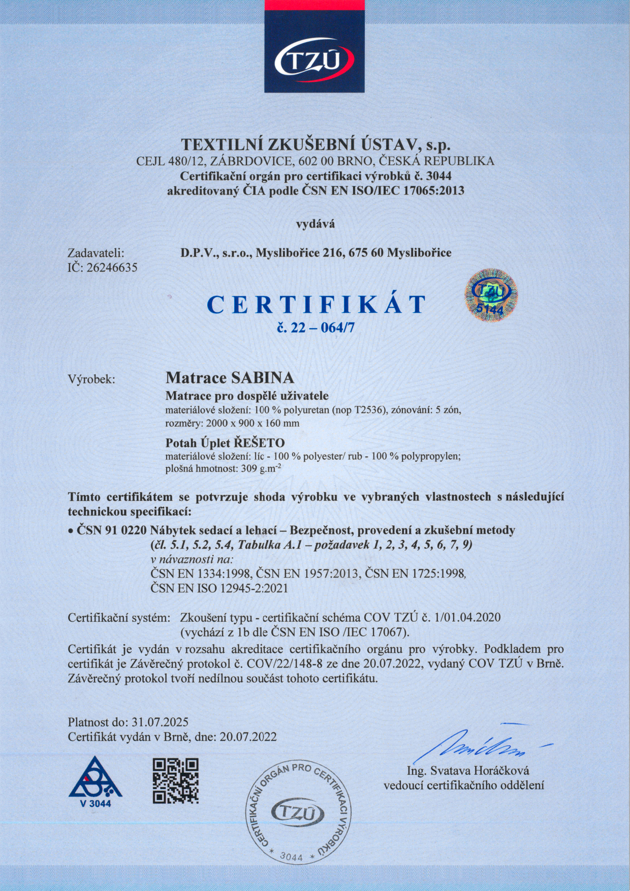 - ZKUŠEBNA NÁBYTKU TZÚ Brno – Certifikát č. 22-064/7