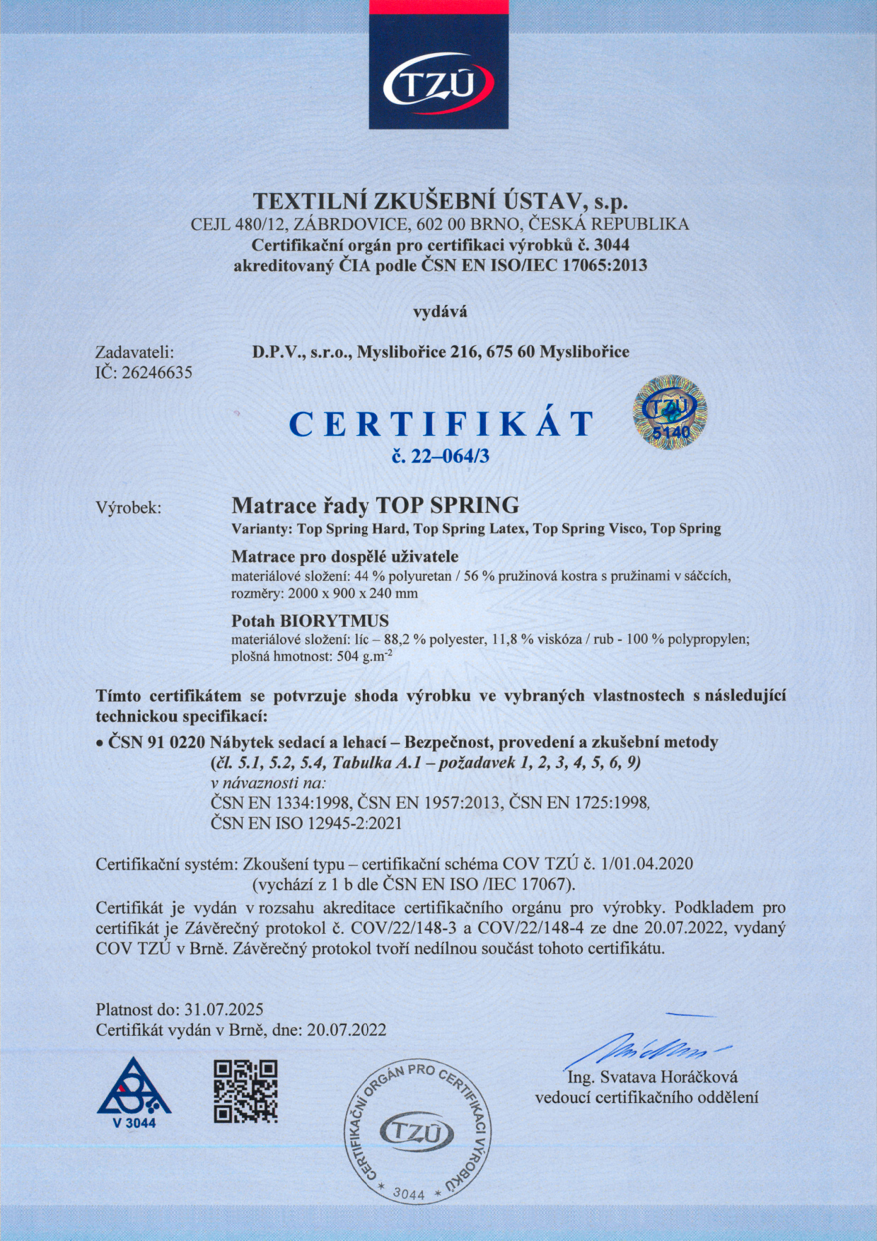 - Textilní Zkušební Ústav – Certifikát č. 21-085