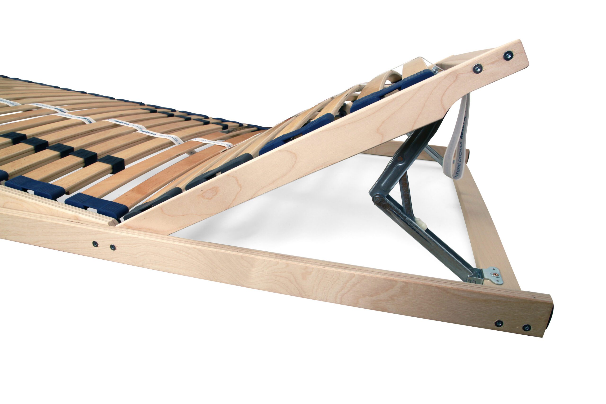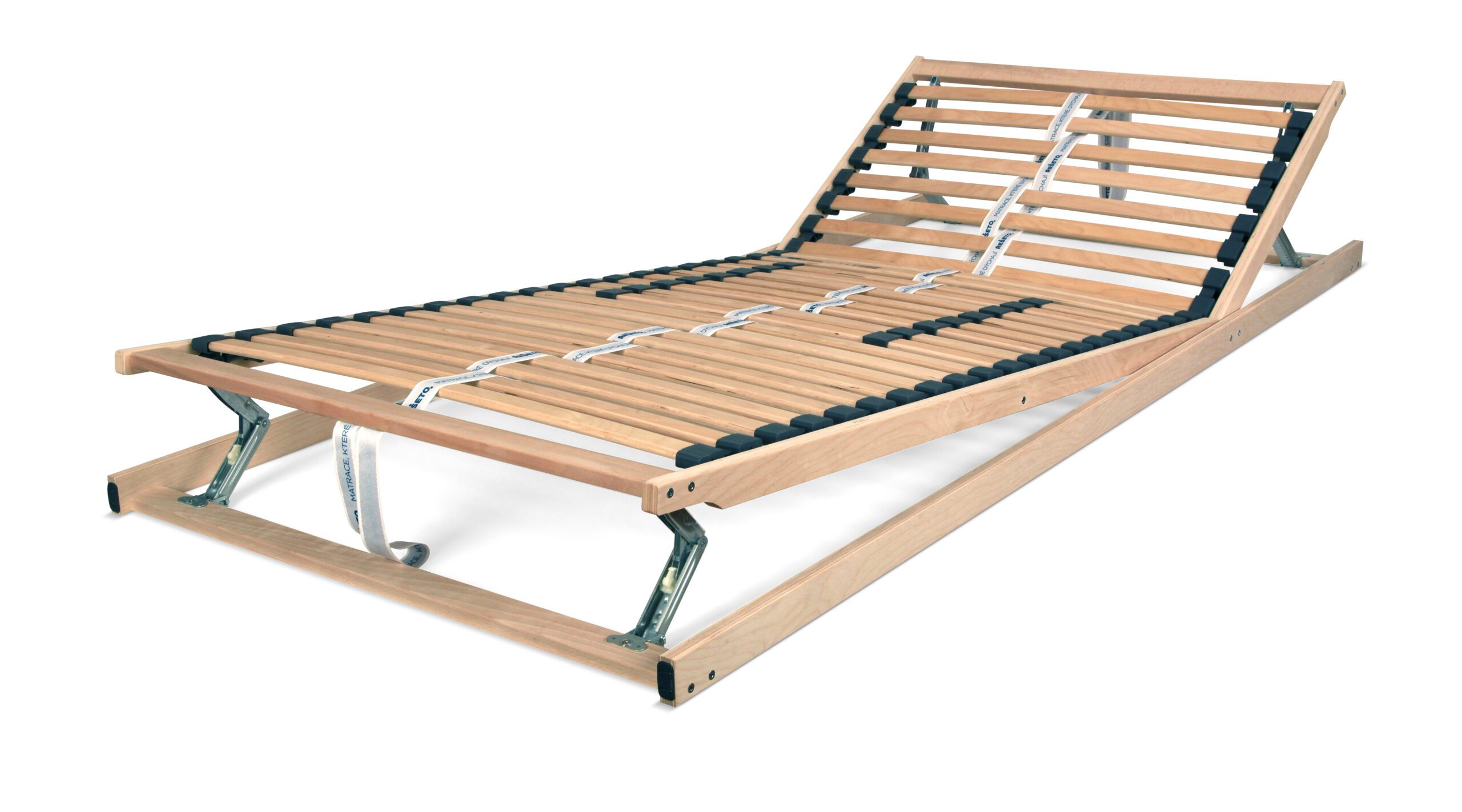 Předpjaté lamely uložené v kaučukových pouzdrech zajišťují optimální pružnost a oporu matrace. Středový popruh rovnoměrně rozkládá zatížení pro vyšší stabilitu. V bederní oblasti lze nastavit tuhost dle požadavků uživatele. Rám z vrstveného dřeva zaručuje vysokou pevnost i životnost.